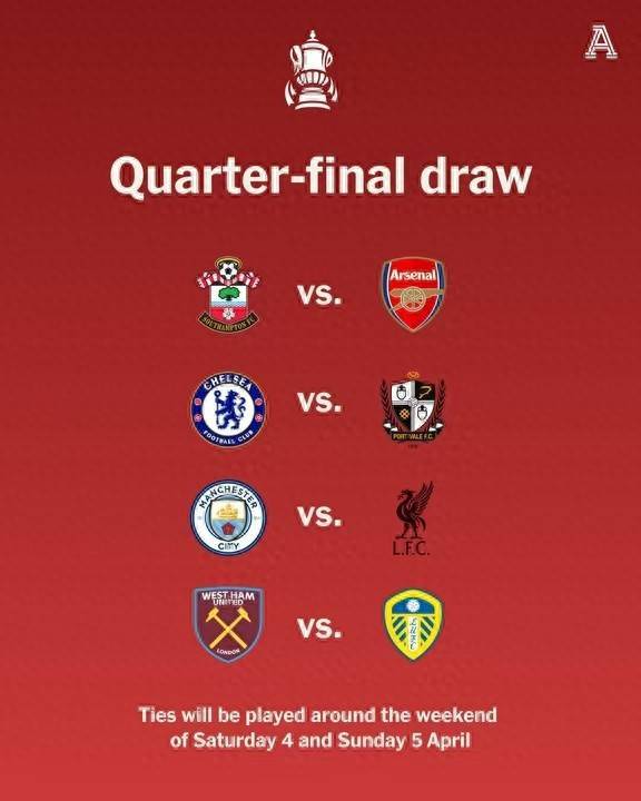 本赛季的英格兰足总杯1/4决赛的抽签结果已经出炉,曼城又是下下签,遇上了利物浦,阿森纳对决英冠球队,而切尔西真是上上签,遇上了英甲垫底球队。足总杯1/4决赛对阵情况如下: 南安普顿(英冠第8)vs阿森纳,不得不说阿森纳继欧冠之后,足总杯也是好签运,踢个英冠球队,阿森纳可以轮换阵容,蓄力英超和欧冠争冠...
